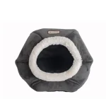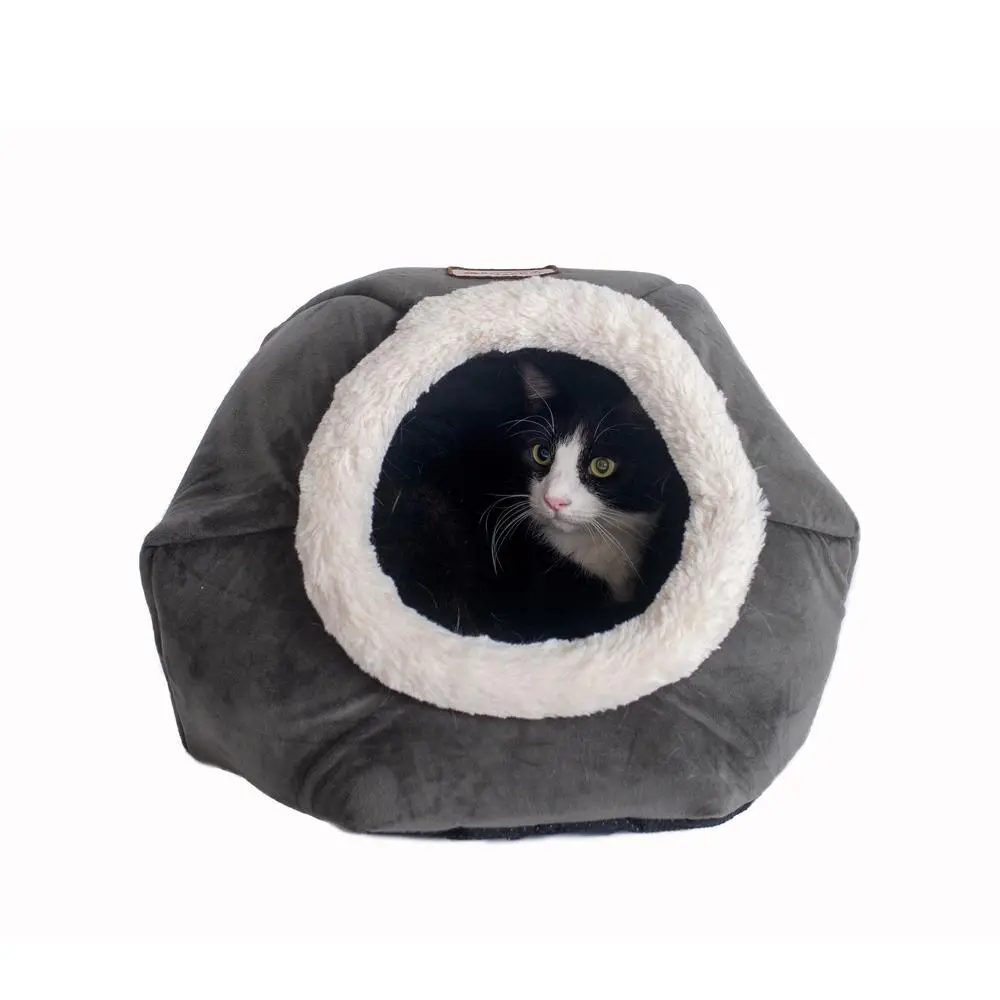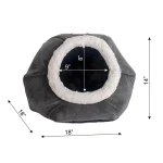 This ultra-soft velvet cat bed has a dark gray color and soft white plush trim. Overall Dimensions: 18″(L) x 18″(W) x 14″(H) Pad Thickness: 2.4″ Snuggly hideout for pets that love to curl up and cuddle. Cat bed with dark gray and soft white color combo. Bed combines luxe velvet, soft plush, and flexible foam wall. Features a deep hiding space. Removable cushion that is machine washable for easy maintenance. Skid-free and water resistant base.